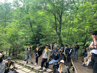 まずは、クラスみんなで、泉門池を目指します。森林浴をしながらのハイキングは、気持ちよかったです。